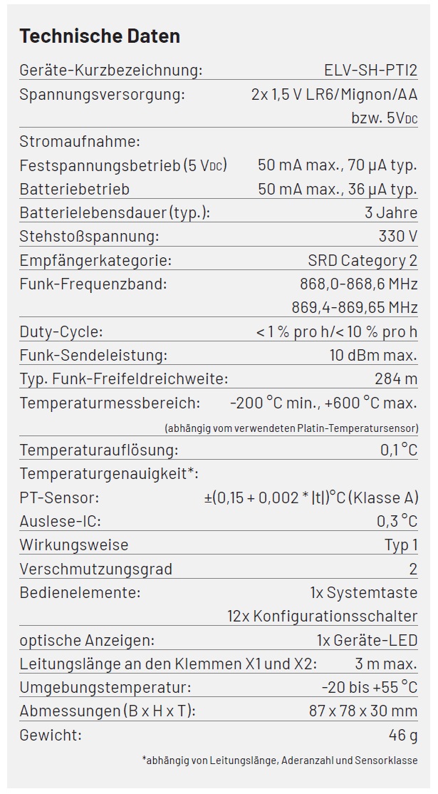 Das ELV-SH-PTI2 bildet die perfekte Verbindung zwischen anspruchsvollen Smart-Home-Anwendungen und professioneller Messtechnik. Über den Anschluss von PT100- oder PT1000-Sensoren lassen sich selbst extreme Temperaturen exakt erfassen – von -200 °C bis +600 °C, abhängig vom eingesetzten Platin-Temperatursensor.